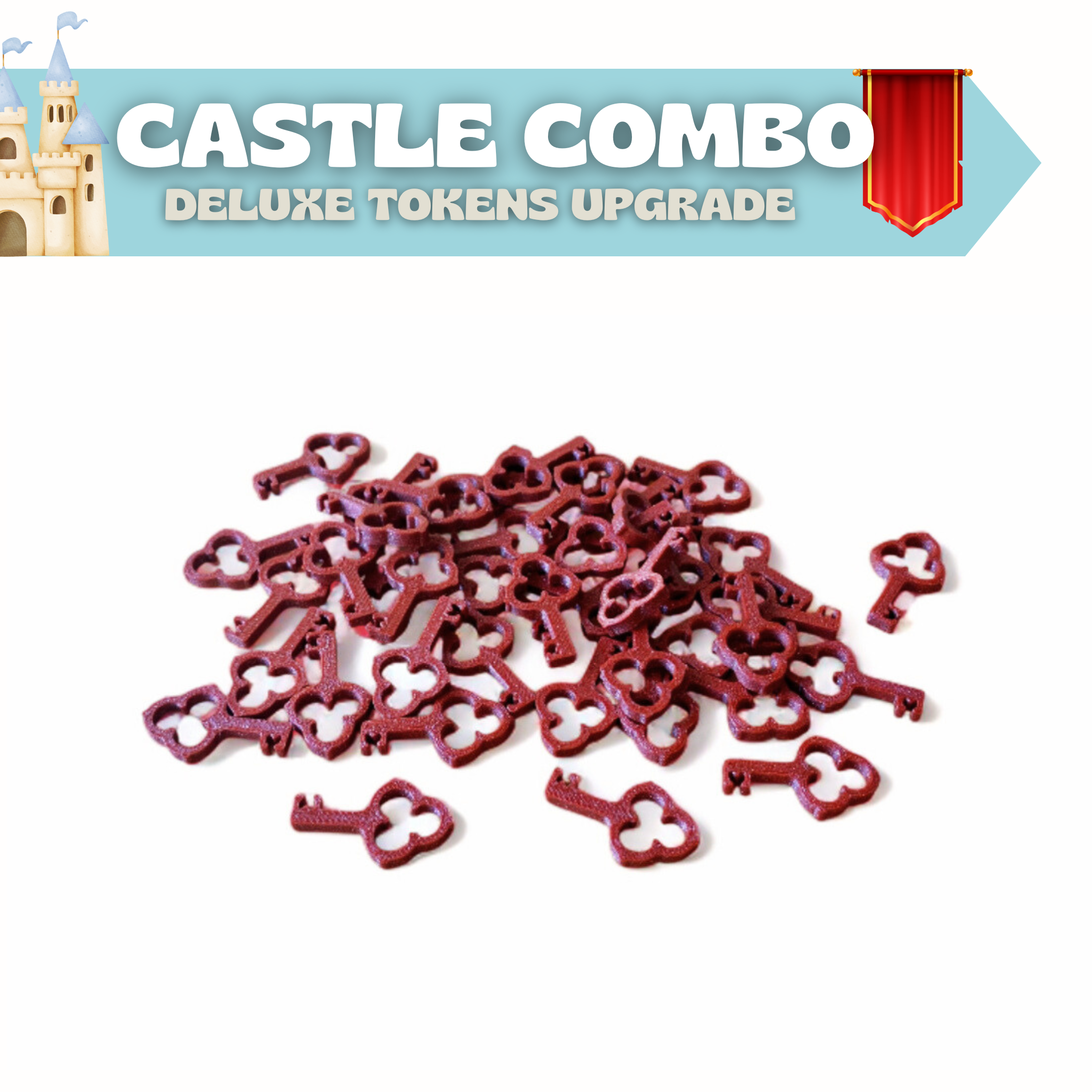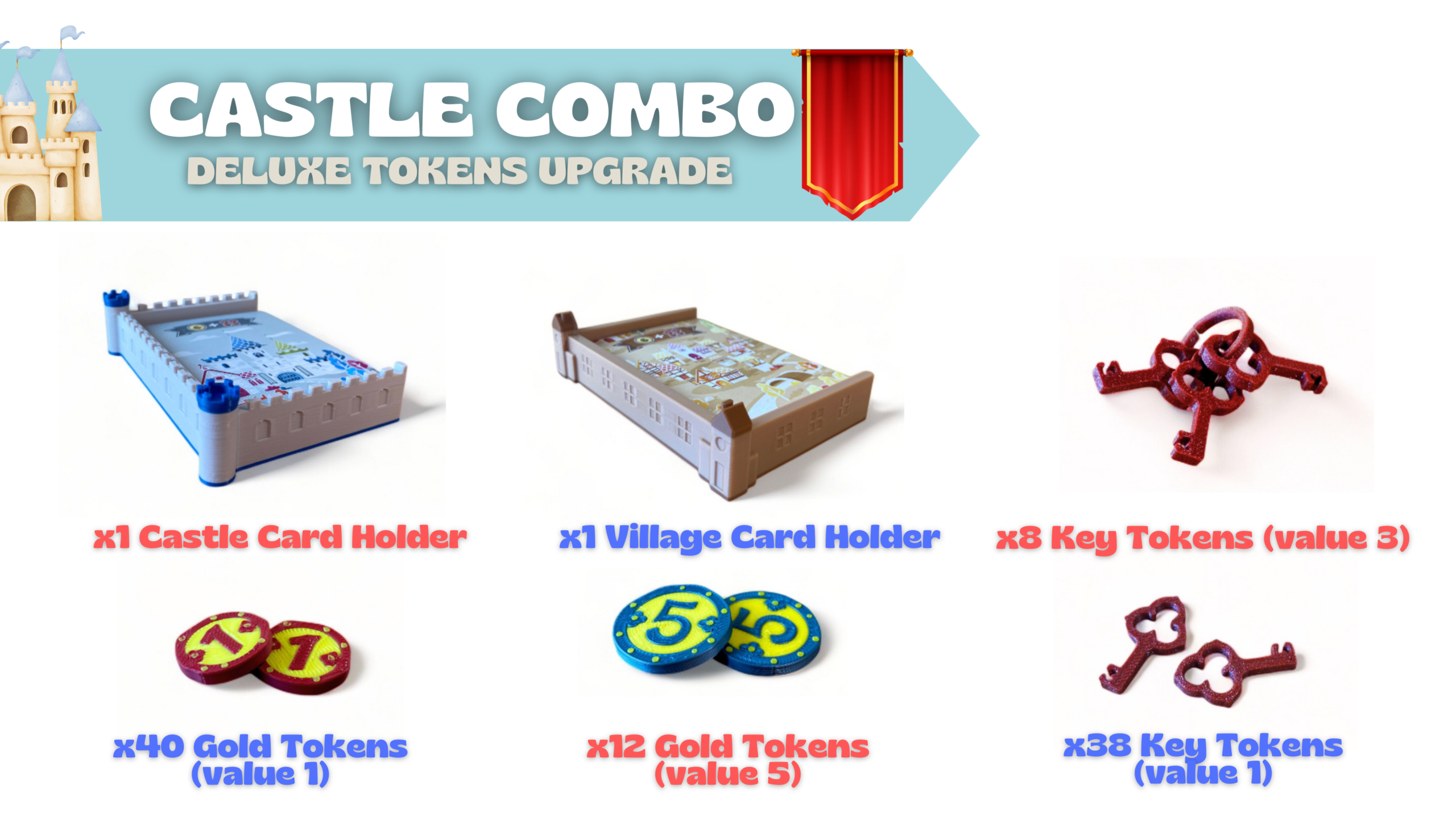 Transform your games with intricately designed coins, keys, and card holders—both for your bustling village and towering castle. Every piece is crafted to capture the playful spirit and tactical battles of Castle Combo, making each turn more immersive and every victory even sweeter. Upgrade your stronghold and let your castle become the envy of the realm!