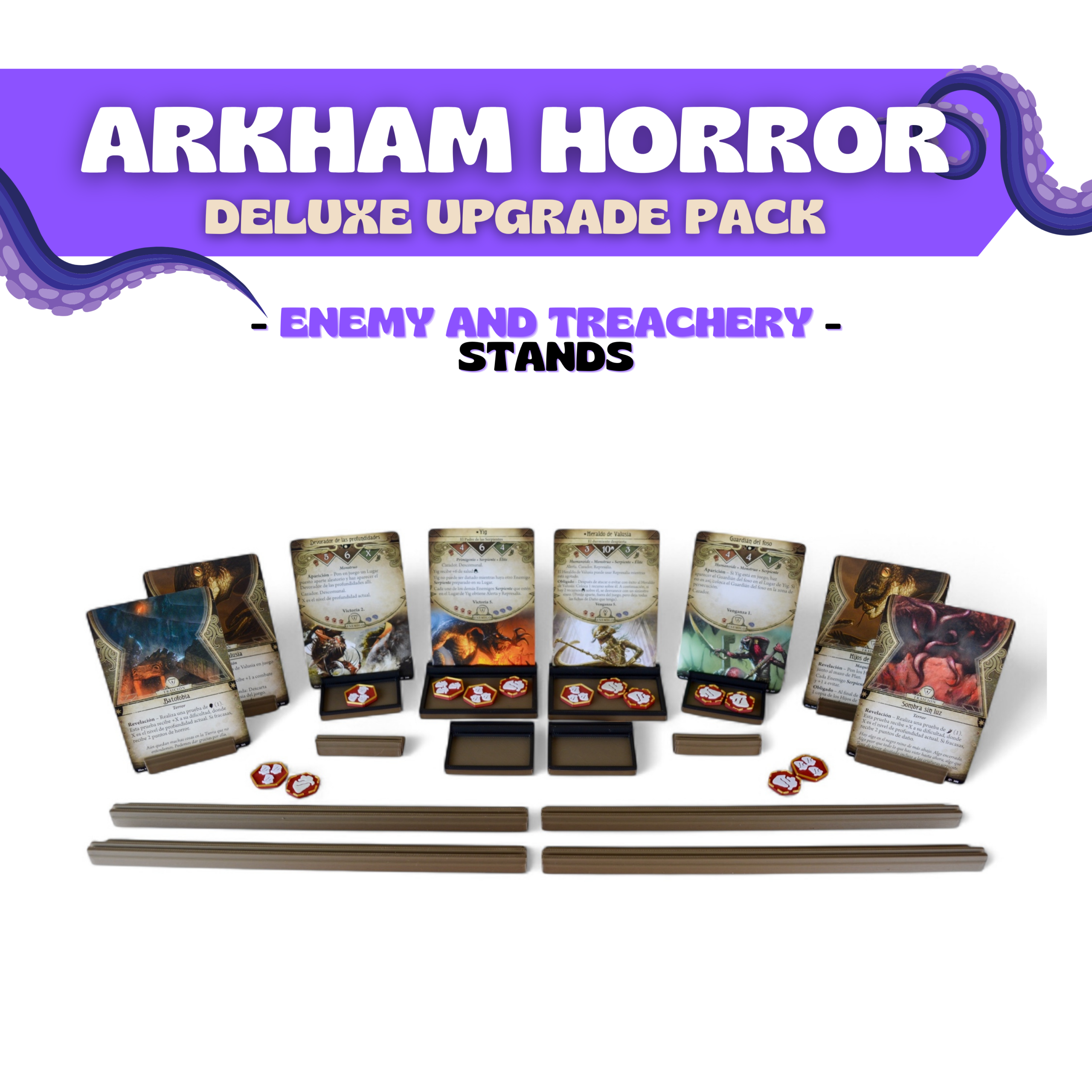 Perfect for keeping Enemy cards, Ancient One bosses, and Treachery encounters clearly visible during play. This pack includes a variety of stands adapted to different situations: from single treachery holders to larger stands designed for multiple cards or multiplayer campaigns.