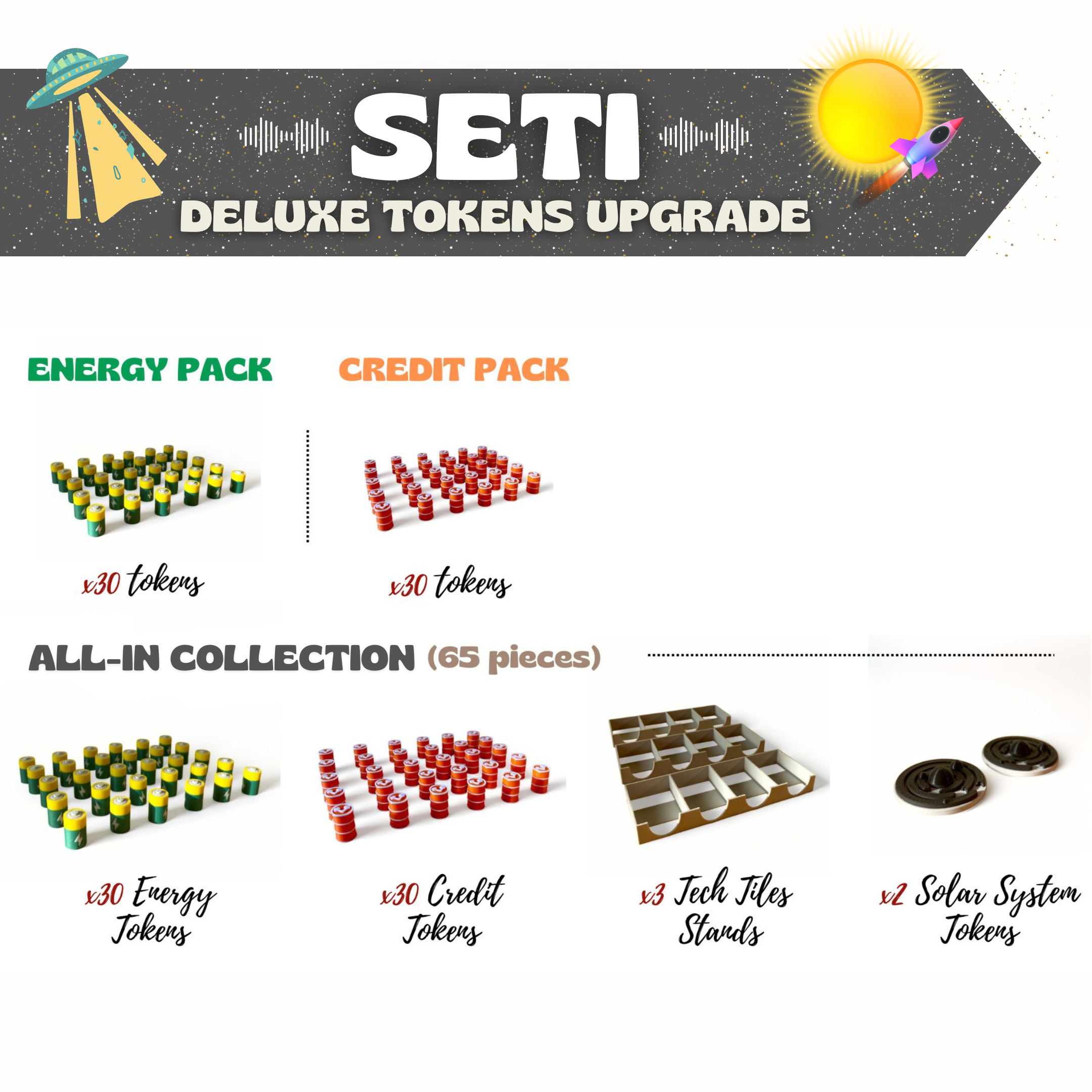Bring every space mission to life with beautifully crafted 3D components that transform your gameplay. Feel the thrill of discovering new planets and mysterious signals as your table becomes a true interstellar command center. Take your galactic adventure of SETI to the next level!